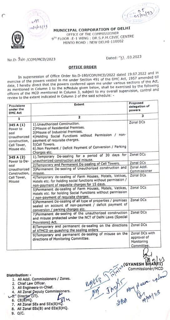 The powers relating to both sealing and de-sealing of property flow to the Commissioner, MCD, under Section 345A of the DMC Act, 1957. These powers are further delegated to the Deputy Commissioner, MCD, by virtue of Section 491 of the said Act.